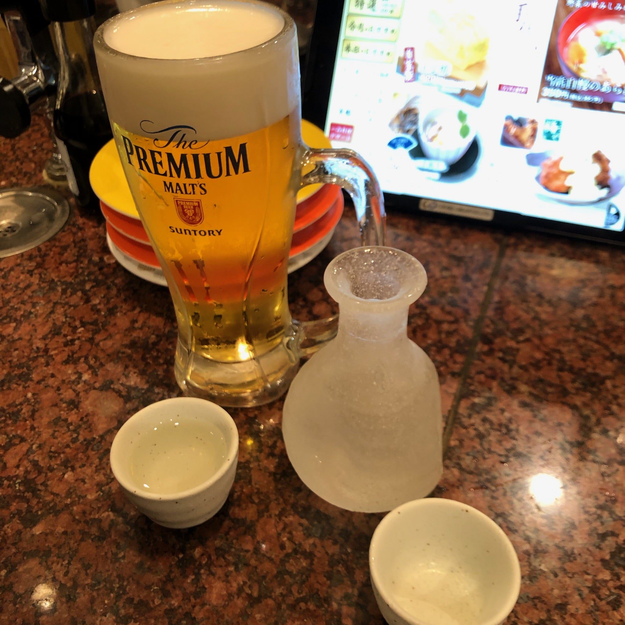 居酒屋を出た足で直帰を促すも「食べ足りない」と断られ、、、 やむなく回るお鮨屋さんへ ビールも日本酒も彼 タコぶつ あら汁をゆっくりと味わう私はノンアルコール うに軍艦、あって良かったね 鶏唐揚げ(梅や) 追加は柑橘系ビール(間違えて発注?) 大トロたく この時点で18時すぎ既に入店待ち行列ができていて(ざっと20人)それなのにカウンターで眠りかけてる(@@ とにかく何度も声がけし急かせて退店。。。危ない危ない さらに帰路で食べ足りないと言いコンビニ入店完全なる深酔い外で待つもなかなか出てこず、何度かチェック…怪しい足取りでなんとか帰宅。 そのまま何も食べずソファで爆睡、、、無事で何より(^^;