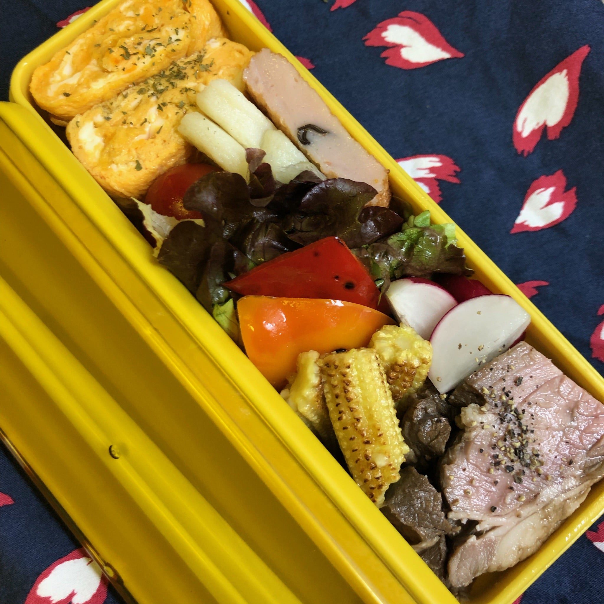 彼のお弁当記録 いつものように詰め合わせは前夜作ったのはパプリカ2色とヤングコーングリルだけ(^^; 豚バラ煮込み、ヤングコーン&パプリカグリル、ラディッシュ、サニーレタス、トマト、卵焼き、練り物2種(鈴廣) 玄米ご飯は朝、彼がレンジ解凍してくれるので冷めるのを待って詰める保冷剤を付けて包んだら出来上がり~ 鈴廣のあげかま